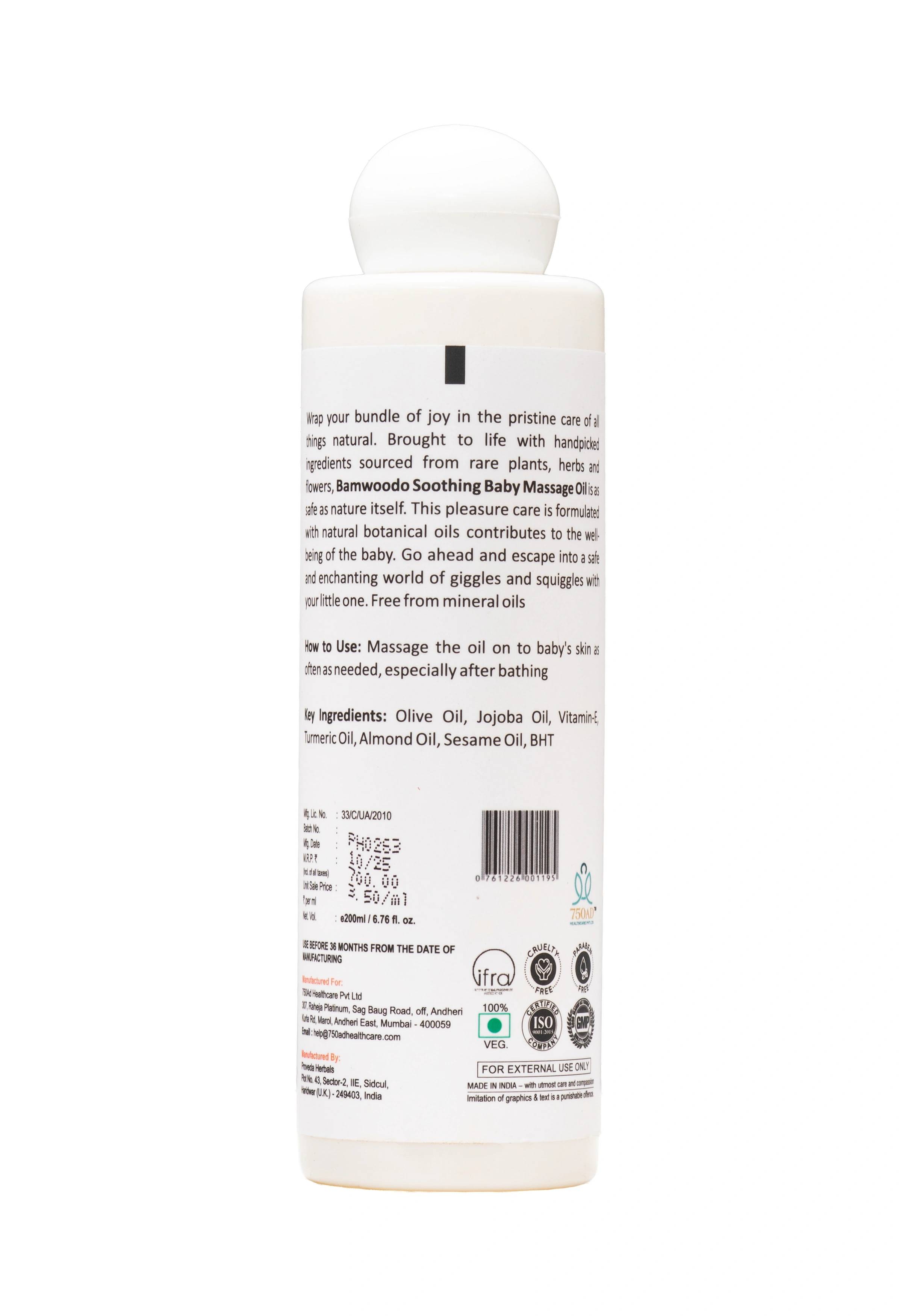 Wrap your bundle of joy in the pristine care of a brand that rings natural. Bamwoodo Soothing Baby Massage Oil (200ml) is a Dermatologist Approved formula that Nourishes & Strengthens baby's skin. This oil is gentle and formulated with natural botanical oils to be safe as nature itself.