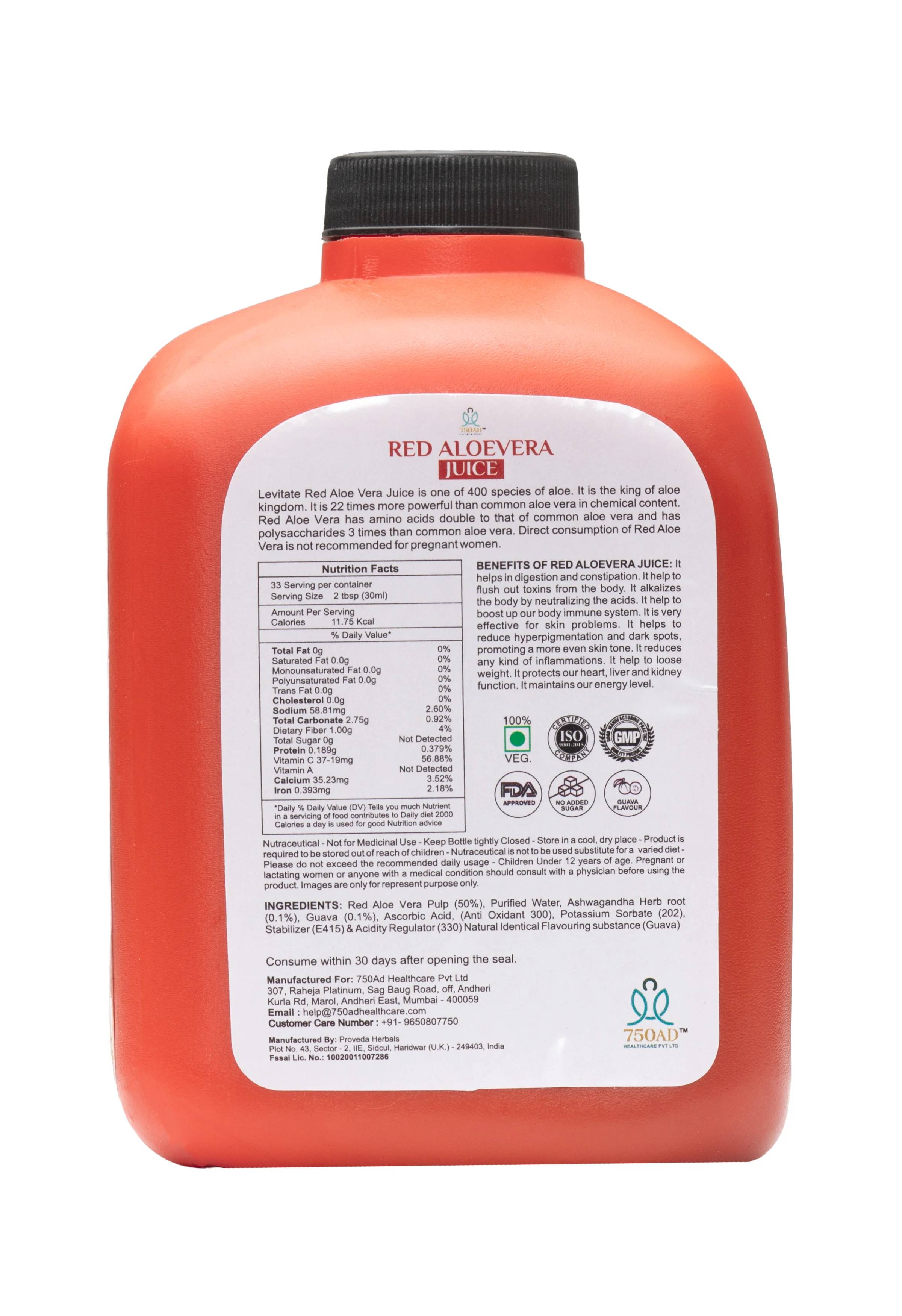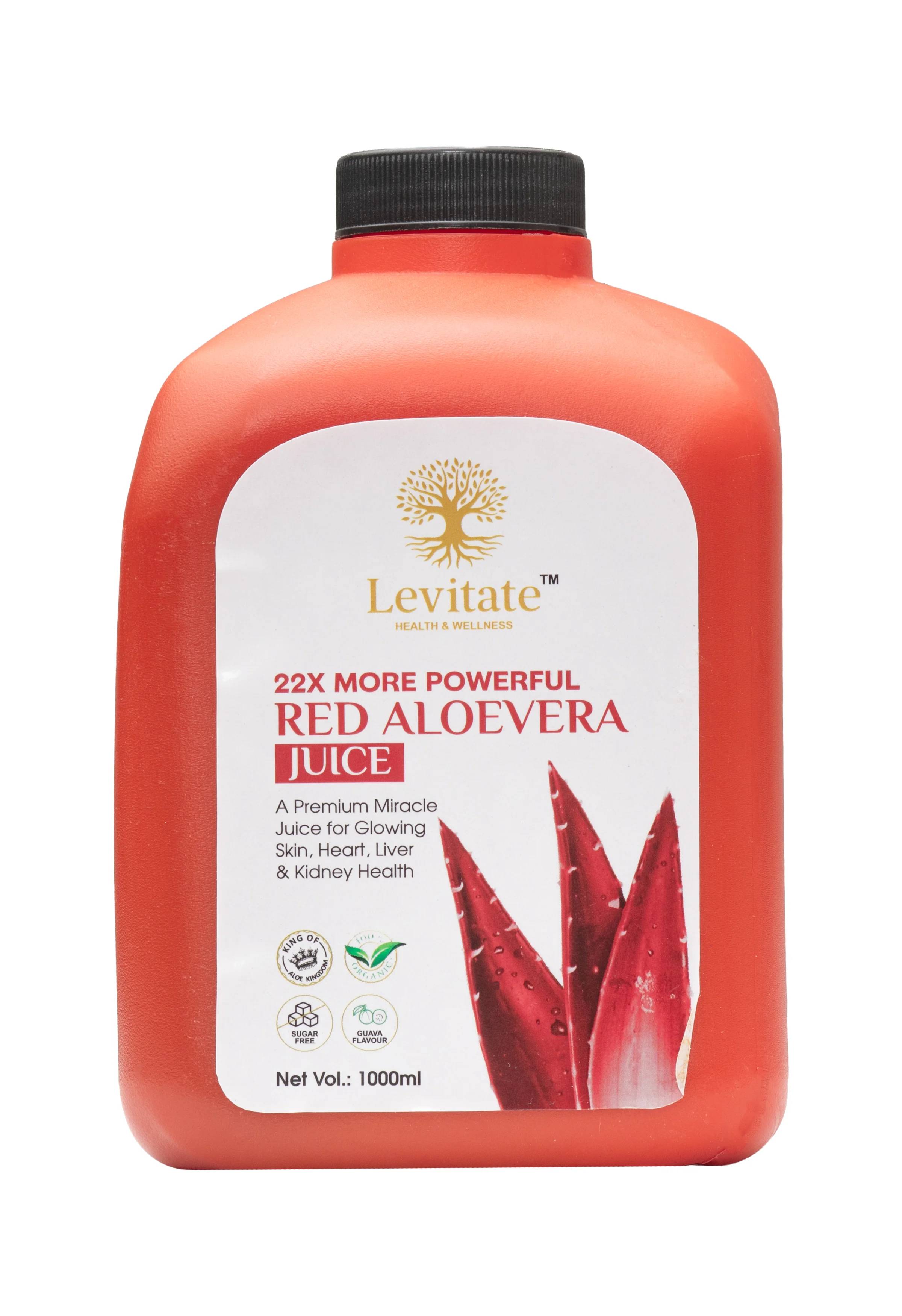 Embrace the power of nature's potent healer with Levitate Red Aloe Vera Juice (500 ml). Red Aloe Vera is scientifically considered up to 22 times more powerful and effective than common green Aloe Vera, being richer in essential compounds like amino acids, vitamins, and antioxidants. This juice is a Sugar Free Formula that aids in Detoxification, Digestion, Immunity, and Skin Health.